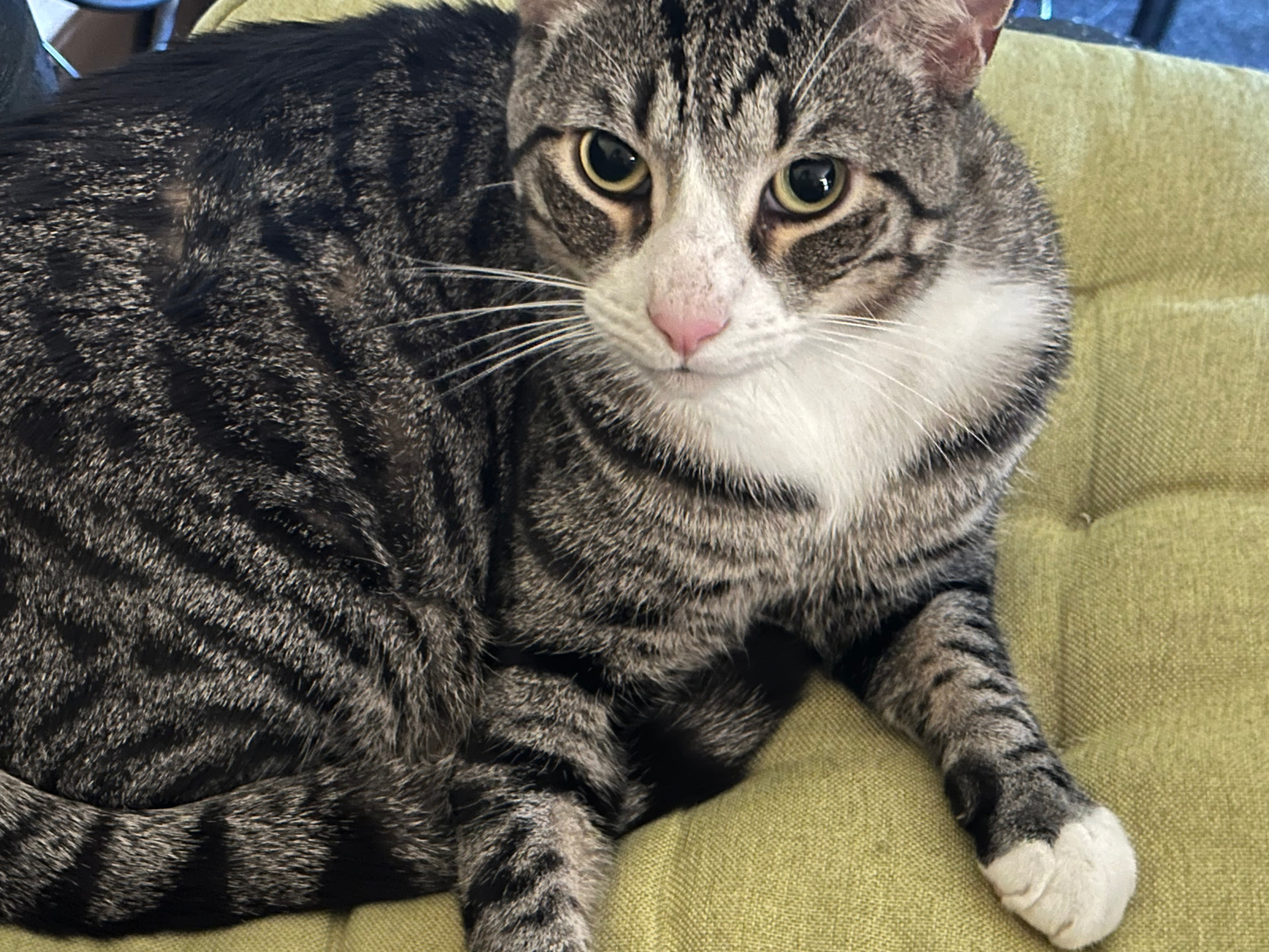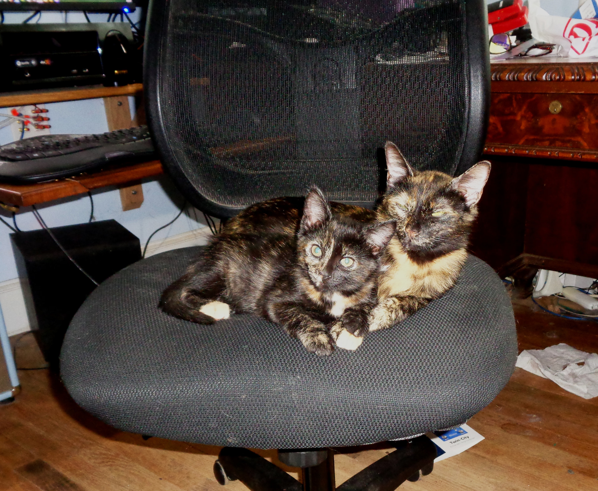 The Senior FC and one of the regulars relaxing after invading my husband’s desk and occupying the chair, (you can see the debris field in the background…)