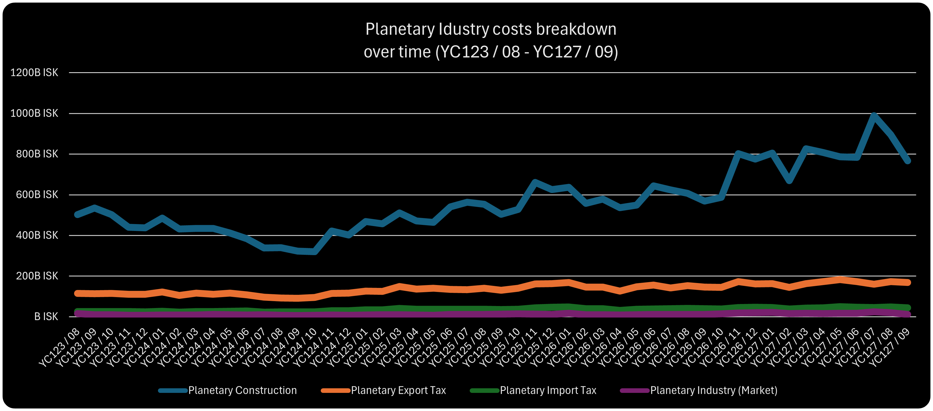 Cost type ISK Value Production type affected Planetary Construction 767.4 B PI Schematics Planetary Export tax 168.7 B PI Schematics / BPO Planetary Import tax 44.8 B PI Schematics Planetary Industry [Market] 12.1 B PI Schematics PI Total 993.0 B This statistics are a baseline, so to speak, for projecting the costs further. The main cost driver will be the conflict. Conflict with rogue warclones attacking Capsuleers and conflicts between Capsuleers using warclones in general as an attack vector.