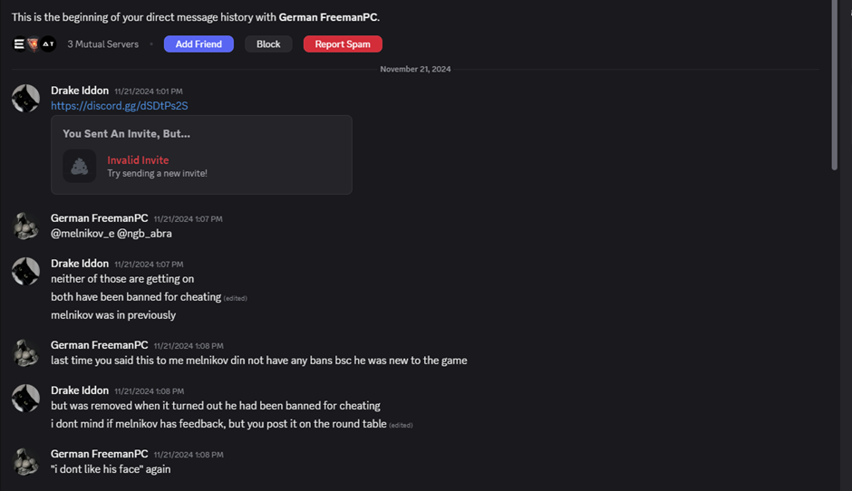 This guy starting from 2023 was “collecting logs” and send them to CCP if seen in them some threads or cheats or something. He was involved in mass petitions were i was banned in 2023 and after investigation - i was unbanned. After this he started his own investigation and teal those days he still collect against us logs. I am not sure why he hate us so much but many times on official discord he said we were liars and he had 100% information from verified players - almost all of those players atm are banned for RMT and now when i asked him were the info come - he don’t answer.