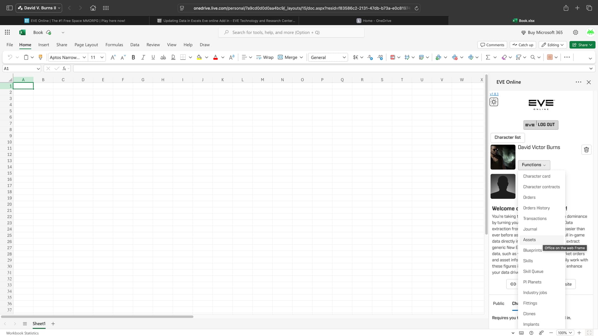 To my surprise after creating a new Workbook most Functions now perform. I even closed my Workbook and am able to successfully open it again. However, some Functions are still not performing. I have not tested every single one but I don’t mind doing so if it would be helpful. In these screenshots can be seen how the Assets Function is not performing. I tried doing so without an active session on EVE as well as with an active session, I also tried signing out and in on Excel during my active session on EVE.